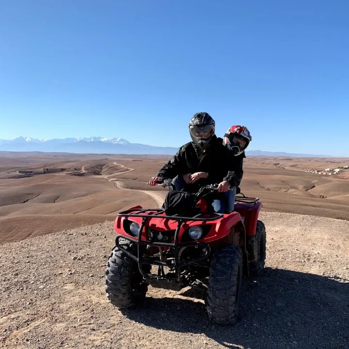 Experience the thrill of the Agafay desert on a thrilling quad bike tour. This adventure combines adrenaline and awe-inspiring scenery. Guided by experts, you'll travel along stone and sand paths, crossing hills that offer spectacular views of the Atlas Mountains.