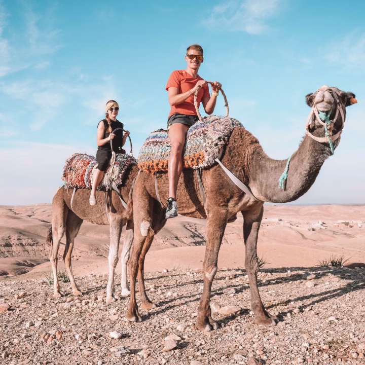 Experience the magic of the desert with a camel ride through the Agafay hills. Discover the silence and golden light of a dream landscape, with panoramic views of the Atlas Mountains. The excursion includes a break for menta tea in a traditional jaima, the perfect moment to capture unforgettable sunset photos.