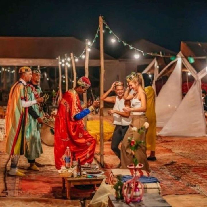 Experience an unforgettable evening with our dinner under the stars in the Agafay desert, a magical adventure just a few kilometers from Marrakech. You'll be welcomed into a traditional tent (jaima) to enjoy a typical dinner. The atmosphere is rounded off with mint tea and live traditional music, under a pure, starry sky.